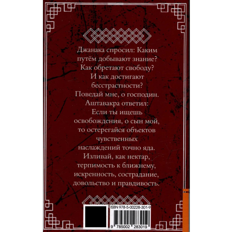 Аштавакра-гита — священный текст индуизма, излагающий философию адвайта-веданты. Это беседа индийского мудреца Аштавакры и легендарного царя царства Митхилы по имени Джанака. Мистический опыт, описанный в Аштавакра-гите, по своей силе, выразительности и поэтичности можно сравнить с диалогами Платона, Дао дэ цзин и Бхагавад-гитой. Ознакомившись с настоящим изданием, вы прикоснётесь к глубокой мудрости религиозной философии адвайта-веданты. Для широкого круга читателей, интересующихся индуизмом.