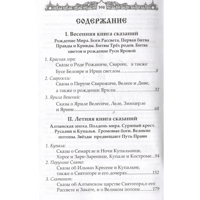 Эта книга сказов и преданий о Сотворении Мира, о древних богах и героях славян, об Алтынской и Борейской эпохах (о временах Атлантиды и Гипербореи), а также о Конце и новом Возрождении мира.Дан также календарь цветов и звёзд, к датам коего приурочены славянские мифы.