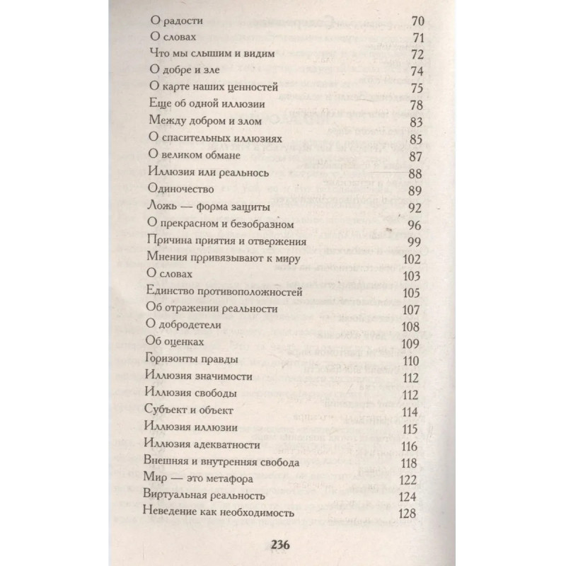 Каждое из живых существ, обитающих на Земле, не воспринимают реальность такой, какова она есть в действительности. Внешние органы чувств животных и человека воспринимают иллюзию, потому что сама по себе материя проявленного мира не имеет тех качеств, которые каждому из людей кажутся очевидными. Существует еще множество других иллюзий, которые воспринимаются человеком как реальности, в том числе и иллюзия восприятия человеком самого себя. В своих многих беседах автор раскрывает суть иллюзий проявленного мира и их необходимость для эволюции сознания современного человека.