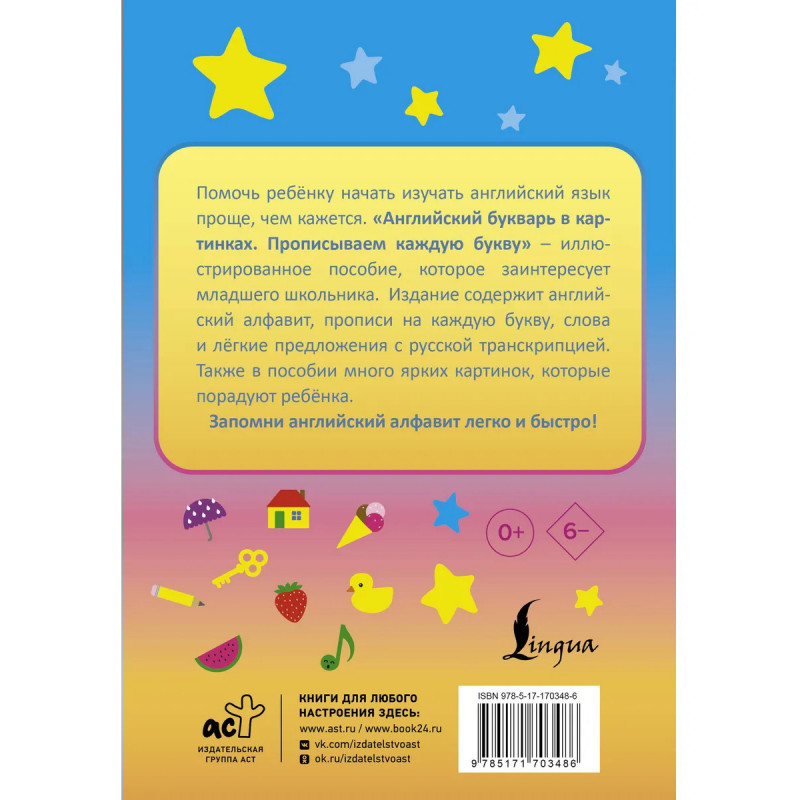 Помочь ребёнку начать изучать английский язык проще, чем кажется. "Английский букварь в картинках. Прописываем каждую букву" - иллюстрированное пособие, которое заинтересует младшего школьника, поможет быстро выучить алфавит и запомнить новые слова. Примеры слов и лёгкие предложения сопровождаются русской транскрипцией для запоминания правильного произношения. Также в издании предусмотрены прописи и краткий словарик. Работа с пособием способствует всестороннему изучению языка, развитию речевых навыков и расширению словарного запаса. Книга подходит для учащихся начальных классов, а также будет полезна родителям и учителям для работы дома и в школе.