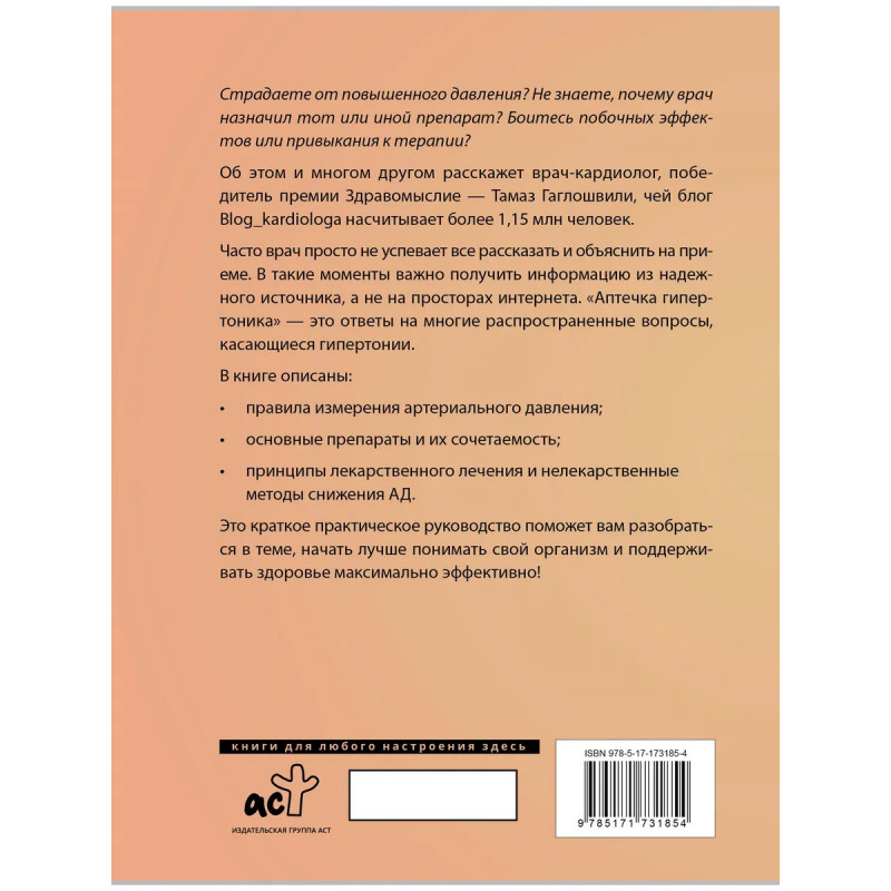 Страдаете от повышенного давления? Не знаете, почему врач назначил тот или иной препарат? Боитесь побочных эффектов или привыкания к терапии? Об этом и многом другом расскажет врач-кардиолог, автор блога о здоровье сердечно-сосудистой системы Blog_kardiologa с аудиторией более 1,15 млн подписчиков и победитель премии Здравомыслие — Тамаз Гаглошвили. Часто врач просто не успевает все рассказать и объяснить на приеме, и в такие моменты важно получить информацию из надежного источника, а не на просторах интернета. "Аптечка гипертоника" — это ответы на многие распространенные вопросы, касающиеся гипертонии. В книге описаны правила измерения артериального давления, принципы лекарственного лечения, основные препараты, их сочетаемость, а также нелекарственные методы снижения АД. Это краткое практическое руководство поможет вам разобраться в теме, начать лучше понимать свой организм и поддерживать здоровье максимально эффективно!