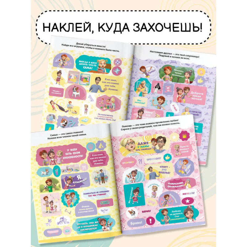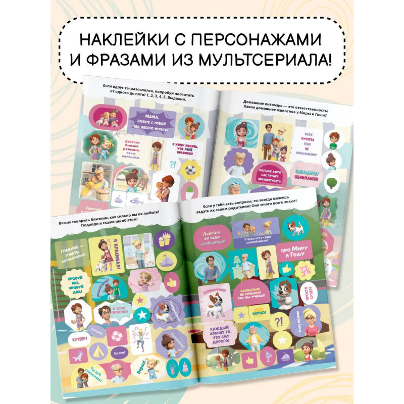 Перед тобой альбом наклеек с любимыми персонажами и цитатами из мультфильма «Про Миру и Гошу». Также в наборе есть стикеры с мотивационными фразами, чтобы сделать процесс обучения веселее и интереснее. Кроме наклеек на каждой страничке тебя ждут увлекательные задания, а также подсказки, которые помогут лучше узнать себя и своих близких! Эти наклейки идеально подходят для украшения тетрадей, дневников, телефона и других любых поверхностей, так любимые персонажи будут всегда с тобой!