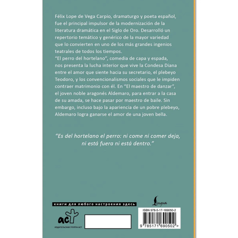 В пьесе "Собака на сене" графиня Диана разрывается между любовью к своему секретарю Теодоро и общественными устоями, мешающими ей выйти за него замуж. А в "Учителе танцев" молодой дворянин Альдемаро, чтобы проникнуть в дом своей возлюбленной, выдает себя за учителя танцев, однако даже под видом простолюдина завоевывает любовь прекрасной девы. Великий испанский драматург Лопе де Вега за свою жизнь написал несколько тысяч пьес, из которых до нас дошла примерно четверть. Комедии, полные жизни, юмора и любви, по-прежнему актуальны и продолжают покорять читателей и зрителей. Тексты комедий публикуются на испанском языке без адаптации и сокращений.