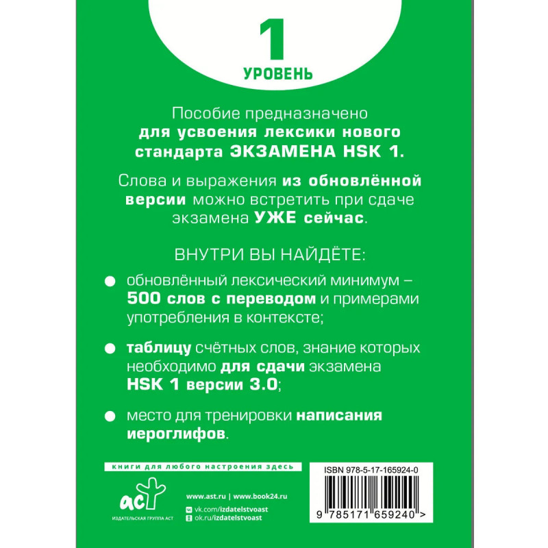 Данное издание содержит список лексики, необходимый для сдачи экзамена HSK 1, соответствующего новому стандарту версии 3.0. Словарь включает в себя 500 слов, которые сопровождаются переводом на русский язык, а также примерами лексической сочетаемости и употребления в контексте. Пособие содержит полезные приложения: таблицу счётных слов и место для тренировки написания иероглифов. Словарь предназначен для широкого круга читателей, рекомендуется всем, кто хочет выучить китайский язык и подготовиться к сдаче международного экзамена HSK.