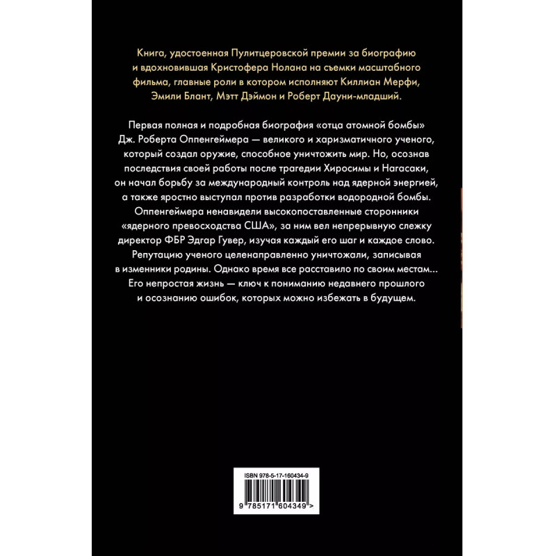 Оппенгеймер. Триумф и трагедия Американского Прометея. Первая полная и подробная биография "отца атомной бомбы" Дж. Роберта Оппенгеймера - великого и харизматичного ученого, который создал оружие, способное уничтожить мир. Но, осознав последствия своей работы после трагедии Хиросимы и Нагасаки, он начал борьбу за международный контроль над ядерной энергией, а также яростно выступал против разработки водородной бомбы. Оппенгеймера ненавидели высокопоставленные сторонники "ядерного превосходства США", за ним вел непрерывную слежку директор ФБР Эдгар Гувер, изучая каждый его шаг и каждое слово. Репутацию ученого целенаправленно уничтожали, записывая в изменники родины. Однако время все расставило на свои места Его непростая жизнь - ключ к пониманию недавнего прошлого и осознанию ошибок, которых можно избежать в будущем.