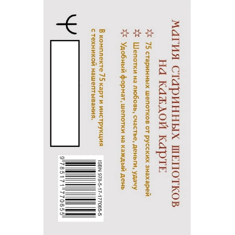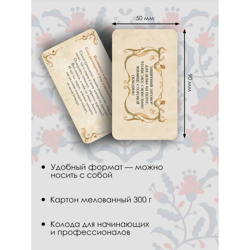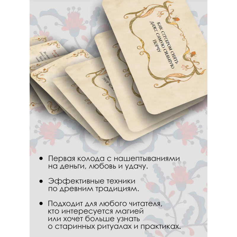Первая колода с заговорами-шепотками! На каждой карте старинный заговор для самых разных случаев: привлечение удачи, денег, любви и защита от негативного воздействия. Шепоток создает вибрацию, которая входит в резонанс с энергиями природы, окружающего мира, человека и Вселенной и создает добрую, благоприятную атмосферу для получения желаемого, хорошего самочувствия и настроения. В комплекте с картами есть небольшая брошюра: вы найдете авторские техники Олеси Великорайской, они помогут вам выполнить шепоток правильно, наполнить его силой, не навредить. Благодаря удобному формату колоду можно брать с собой и практиковать нашептывания каждый день в любое время. Карты подойдут для любого читателя, кто интересуется магией, а также хочет больше узнать о старинных ритуалах и практиках.