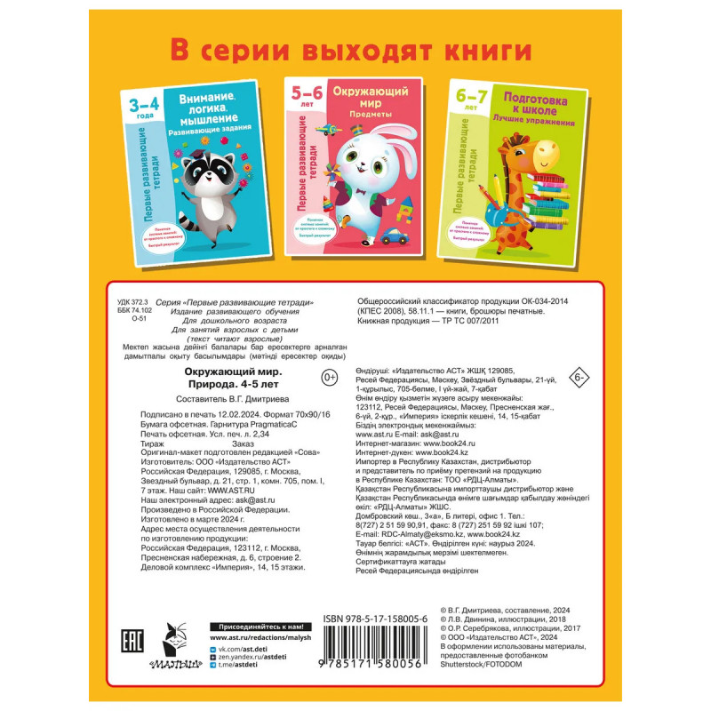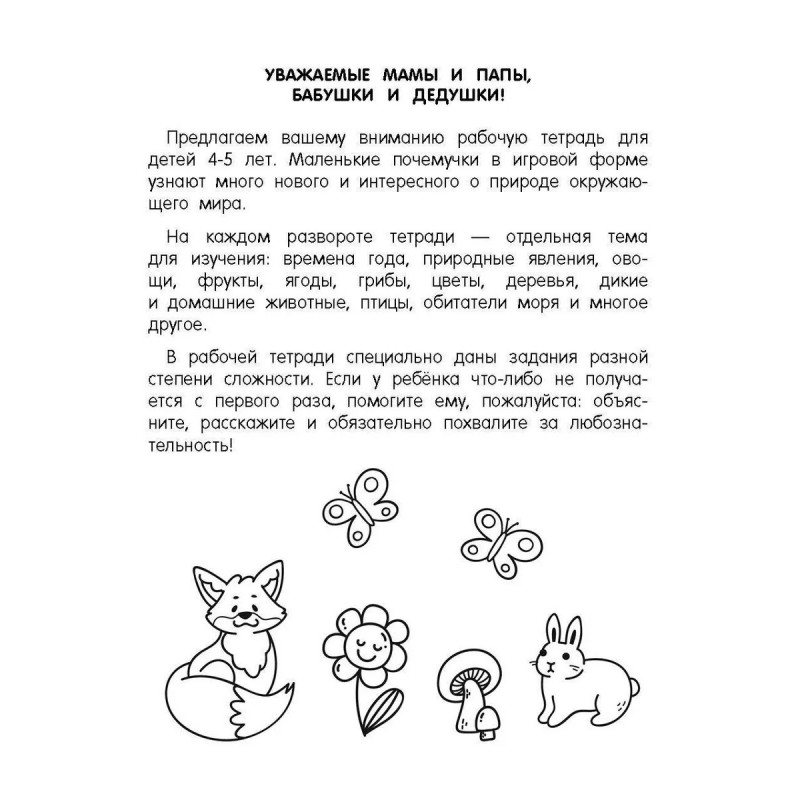 4-5 лет — классический возраст почемучек. Маленьким исследователям любопытно абсолютно всё! Давайте вместе поддержим исследовательский интерес юных учёных! Рабочая тетрадь «Окружающий мир. Природа» состоит из занимательных задачек, лабиринтов, головоломок для тренировки памяти, внимания, логики и мышления. На каждом развороте тетради — отдельная тема для изучения: времена года, природные явления, овощи, фрукты, ягоды, грибы, цветы, деревья, дикие и домашние животные, птицы, обитатели моря и многое другое. Обучение в игровой форме поможет малышам легко и быстро усвоить новые знания и сделать первые выводы о закономерностях окружающего мира.