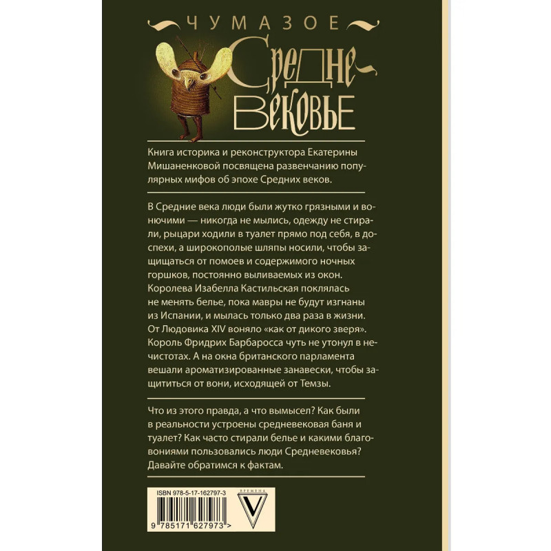 Книга историка и реконструктора Екатерины Мишаненковой посвящена развенчанию популярных мифов об эпохе Средних веков. В Средние века люди были жутко грязными и вонючими — никогда не мылись, одежду не стирали, рыцари ходили в туалет прямо под себя, в доспехи, а широкополые шляпы носили, чтобы защищаться от помоев и содержимого ночных горшков, постоянно выливаемых из окон. Королева Изабелла Кастильская поклялась не менять белье, пока мавры не будут изгнаны из Испании, и мылась только два раза в жизни. От Людовика XIV воняло "как от дикого зверя". Король Фридрих Барбаросса чуть не утонул в нечистотах. А на окна британского парламента вешали ароматизированные занавески, чтобы защититься от вони, исходящей от Темзы. Что из этого правда, а что вымысел? Как была в реальности устроена средневековая баня или туалет? Как части стирали белье и какими благовониями пользовались люди средневековья? Давайте обратимся к фактам.