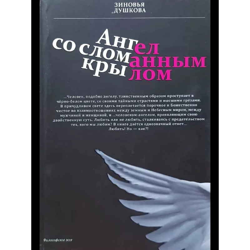 Ангел со сломанным крылом. . Издательство: Издательский Дом ДушковойАнгел со сломанным крылом — произведение, затрагивающее извечную тему противостояния негативного и позитивного, чёрного и белого, другими словами: нелюбви и Любви. В книге раскрываются явные и тайные стороны жизни; и человек, подобно ангелу, таинственным образом проступает в чёрно-белом цвете со своими тайными страстями и высшими грёзами. В причудливом свете здесь переплетается порочное и божественно чистое во взаимоотношениях между земным и Небесным мирами; между мужчиной и женщиной; человеком-ангелом, проявляющим свою двойственную суть. Любить или не любить, сталкиваясь с предательством тех, кого мы любим? В книге даётся однозначный ответ... Любить! Но как?!