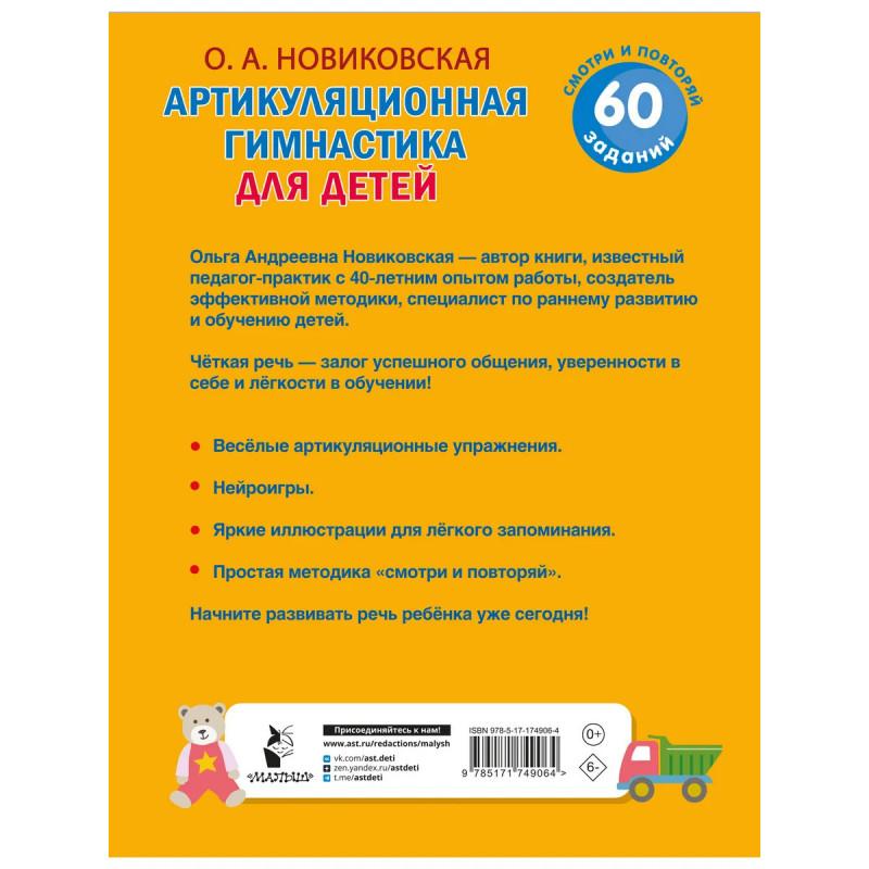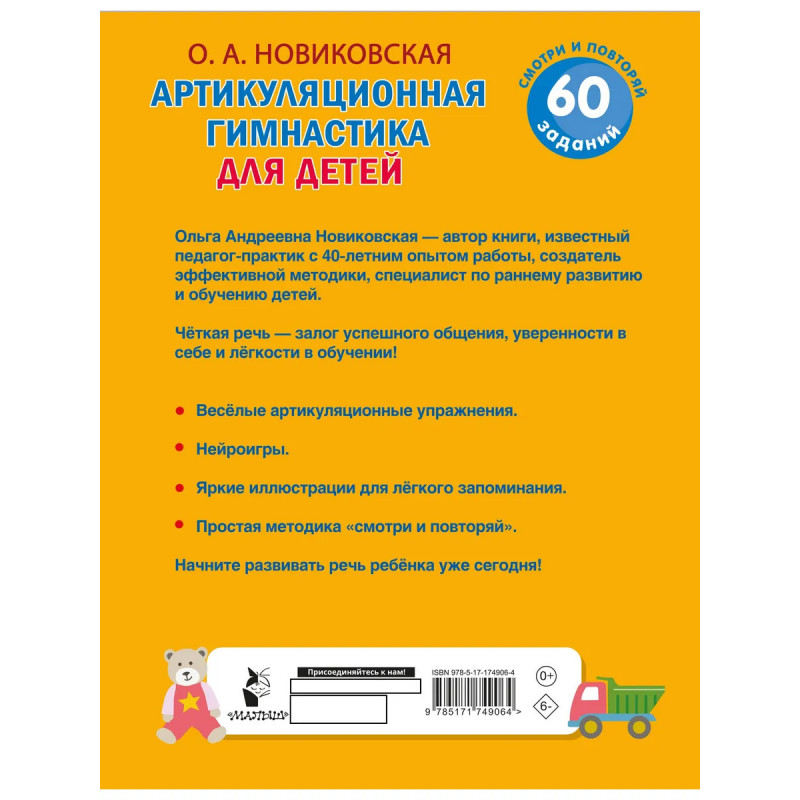 Хотите, чтобы ваш ребёнок говорил чётко и красиво? Книга «Артикуляционная гимнастика для детей» из серии «Нейротренажёр: смотри и повторяй» — это простой и эффективный способ помочь малышу развить правильное произношение и укрепить мышцы речевого аппарата. Почему это важно? Чёткая речь — залог успешного общения, уверенности в себе и лёгкости в обучении! Кто автор? Автор книги — Ольга Андреевна Новиковская — известный и талантливый педагог-практик с 40-летним опытом работы, создатель эффективной методики, специалист по раннему развитию и обучению детей. Что внутри? — Весёлые артикуляционные упражнения. — Нейроигры. — Яркие иллюстрации для лёгкого запоминания. — Простая методика «смотри и повторяй». Книга подходит для занятий дома, в детском саду и с логопедом. Всего несколько минут в день — и ваш малыш заговорит чётко и правильно! Начните развивать речь ребёнка уже сегодня!