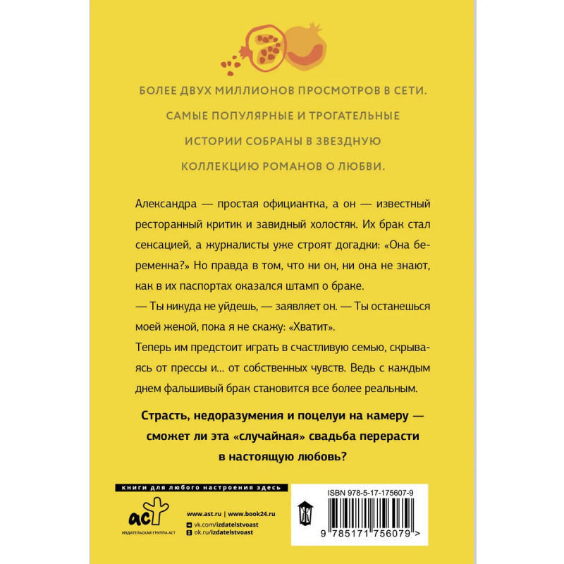 - Хит Рунета! - Свыше двух миллионов прочтений на Литнет! - Порой не ты выбираешь замужество, а замужество выбирает тебя. Искрометная романтическая комедия, в центре которой — штамп о браке, внезапно появившийся в паспортах простой официантки и известного кулинарного критика. - Превосходный юмор, непредвиденные сюжетные повороты и эмоциональные коллизии. -Удобный формат покетбука. - Серия «Звездная коллекция романов о любви» — лучшие книги жанра от современных отечественных авторов.