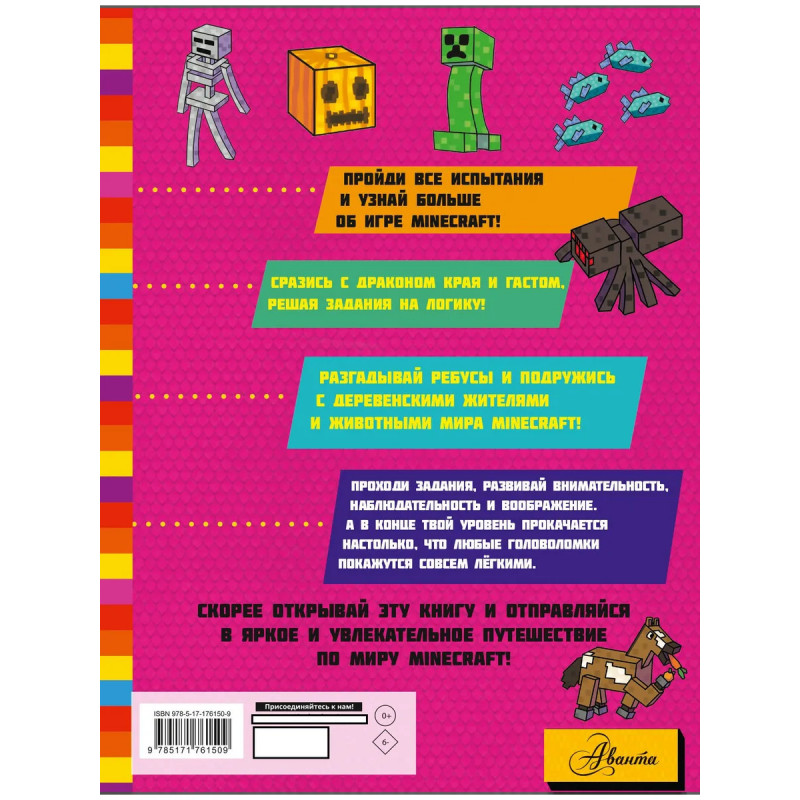 В этой книге есть всё для того, чтобы развлечь скучающих майнкрафтеров! Ведь их ждут захватывающие задачки на логику с зомби и скелетами, а также опасные лабиринты с гастами, головоломки с драконом Края и многое другое. То есть всё, что нужно для мальчиков и девочек, увлечённых миром Minecraft! Книга создана специально для детей младшего школьного возраста — крупные буквы, яркие иллюстрации и увлекательные задачки помогут одновременно подготовиться к школе и весело провести время.