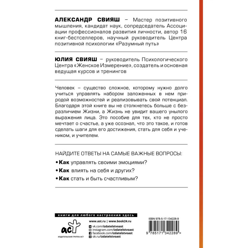 Александр Свияш – Мастер позитивного мышления, кандидат наук, сопредседатель Ассоциации профессионалов развития личности, автор 16 книг-бестселлеров, научный руководитель Центра позитивной психологии «Разумный путь» Юлия Свияш – руководитель Психологического Центра «Женское Измерение», создатель и основная ведущая курсов и тренингов