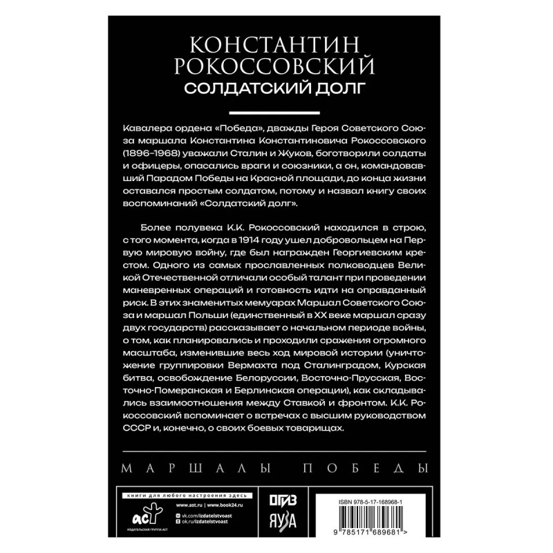 Кавалера ордена "Победа", дважды Героя Советского Союза маршала Константина Константиновича Рокоссовского (1896–1968) уважали Сталин и Жуков, боготворили солдаты и офицеры, опасались враги и союзники, а он, командовавший Парадом Победы на Красной площади, до конца жизни оставался простым солдатом, потому и назвал книгу своих воспоминаний "Солдатский долг".
