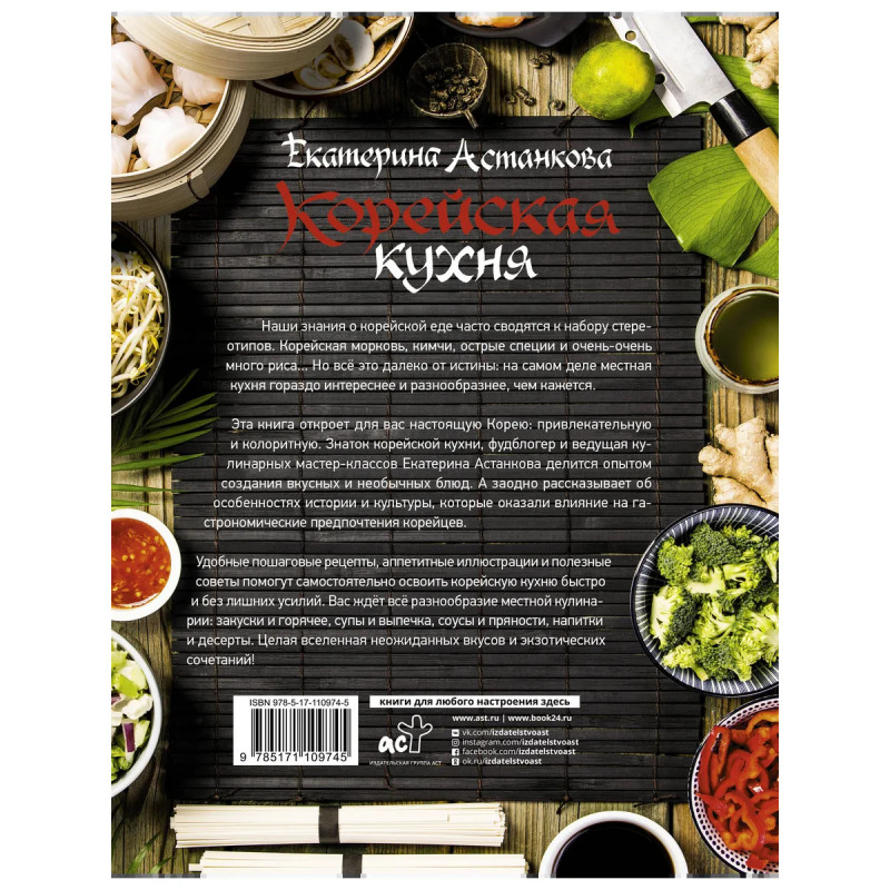 Наши знания о корейской еде часто сводятся к набору стереотипов. Корейская морковь, кимчи, острые специи и очень-очень много риса... Но, как и популярный миф о любви к собачатине, всё это далеко от истины: на самом деле местная кухня гораздо интереснее и разнообразнее, чем кажется. Эта книга откроет для вас настоящую Корею: привлекательную и колоритную. Знаток корейской кухни, фудблогер и ведущая кулинарных мастер-классов Екатерина Астанкова делится опытом создания вкусных и необычных блюд. А заодно рассказывает об особенностях истории и культуры, которые оказали влияние на гастрономические предпочтения корейцев. Удобные пошаговые рецепты, аппетитные иллюстрации и полезные советы помогут самостоятельно освоить корейскую кухню быстро и без лишних усилий. Вас ждёт всё разнообразие местной кулинарии: закуски и горячее, супы и выпечка, соусы и пряности, напитки и десерты. Целая вселенная неожиданных вкусов и экзотических сочетаний!