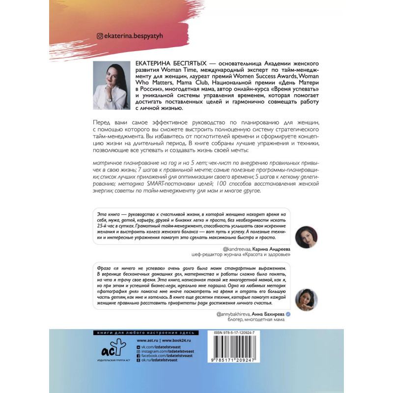 Ресурсный тайм-менеджмент для женщин. Екатерина Беспятых - основательница Академии женского развития Woman Time, международный эксперт по тайм-менеджменту и личной эффективности для женщин, лауреат премий Women Success Awards, Woman Who Matters, Mama club, Национальной премии "День Матери в России", автор онлайн-курса "Время успевать" и уникальной системы управления временем, которая помогает достигать поставленных целей и гармонично совмещать работу с личной жизнью. В книге собраны лучшие упражнения и техники, позволяющие все успевать и создавать жизнь своей мечты: " матричное планирование на год и на 5 лет; " чек-лист по внедрению правильных привычек в свою жизнь; " 7 шагов к правильной мечте; " самые полезные программы-планировщики; " список лучших приложений для оптимизации своего времени; " 5 шагов к легкому делегированию; " методика SMART-постановки целей; " 100 способов восстановления женской энергии; " советы по тайм-менеджменту для мам и многое другое.