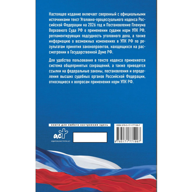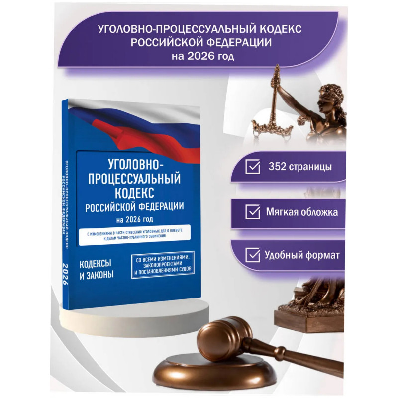 Данное издание Уголовно-процессуального кодекса Российской Федерации сверено с официальным источником и приводится по состоянию на 2026 год. Кодекс учитывает все изменения, опубликованные в официальных источниках на момент подписания издания в печать. В издании представлена информация о возможных изменениях в УПК РФ по результатам принятия законопроектов, находящихся на рассмотрении в Государственной Думе РФ. Для удобства использования в тексте кодекса применяется система общепринятых сокращений, а также приводятся ссылки на федеральные законы, постановления Правительства Российской Федерации, постановления и определения высших судебных органов Российской Федерации, относящиеся к вопросам применения норм уголовного процесса.