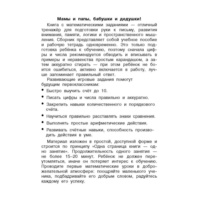 В серии «Первые развивающие тетради» — книги для любознательных малышей и заботливых родителей. Рабочая тетрадь «Считаю до 10. 5–6 лет» представляет интерес для будущих первоклассников, а также их родителей, — игровые задания развивают интеллект, формируют математические представления и ориентацию в пространстве, закрепляют правила выполнения простых арифметических действий. Приобретая это пособие для своего ребёнка, вы поможете ему: • подготовить руку к письму, научиться держать ручку и карандаш; • запомнить правильное начертание цифр; • потренироваться в сложении и вычитании; • развить мышление, логику, внимание, память; • стать более усидчивым и аккуратным.