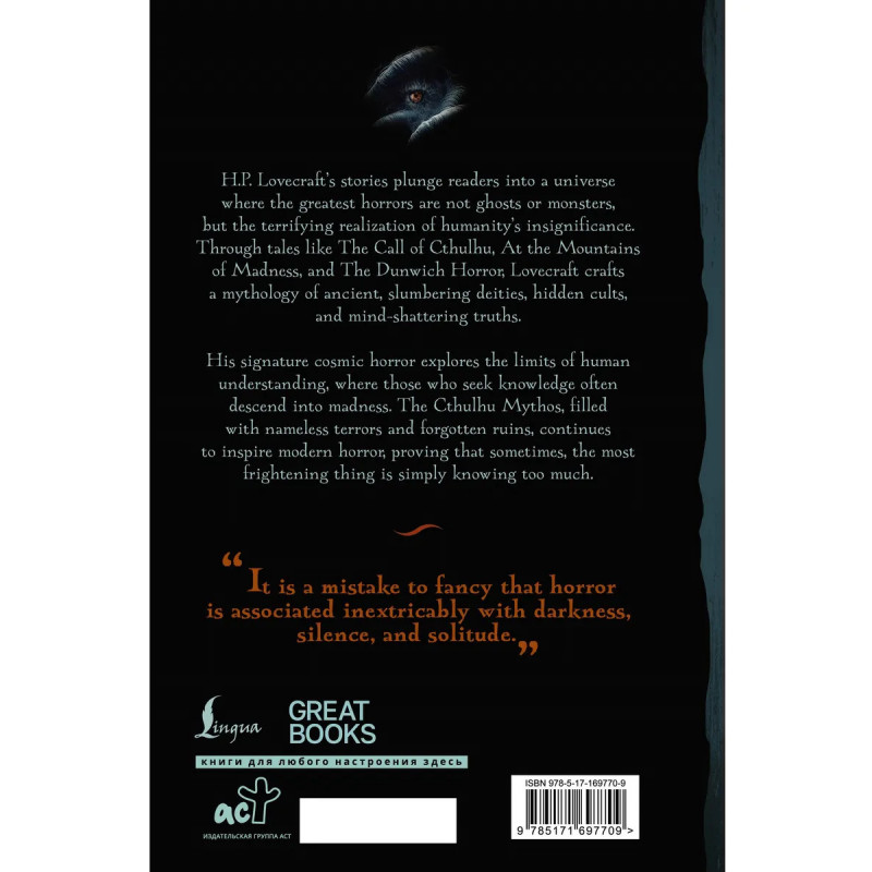 Произведения Г.Ф. Лавкрафта погружают читателей во вселенную, где главный ужас — не призраки или чудовища, а пугающее осознание ничтожности человечества. В таких рассказах, как "Зов Ктулху", "Хребты Безумия" и "Ужас Данвича", Лавкрафт создаёт мифологию древних спящих богов, тайных культов и ужасающих откровений. Его фирменный стиль — космический ужас — исследует пределы человеческого разума, где те, кто жаждет знаний, неизбежно обречены на безумие. Мифы Ктулху, наполненные безымянными ужасами и забытыми руинами, продолжают вдохновлять современных авторов, доказывая, что иногда самое страшное — это просто знать слишком много. В сборник вошли следующие произведения: "The Call of Cthulhu", "At the Mountains of Madness", "The Dunwich Horror", "Cool Air", "The Festival", "Dagon", "The Other Gods", "The Picture in the House", "The Nameless City", "The Outsider", "The Rats in the Walls", "From Beyond", "The Dream-Quest of Unknown Kadath" и "The Shadow out of Time". Все рассказы представлены на языке оригинала.