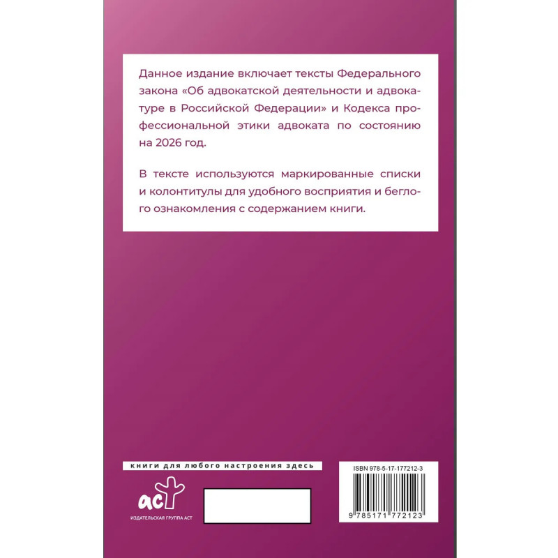 Данное издание включает тексты Федерального закона "Об адвокатской деятельности и адвокатуре в Российской Федерации" и Кодекса профессиональной этики адвоката на 2026 год. В тексте используются маркированные списки и колонтитулы для удобного восприятия и беглого ознакомления с содержанием книги. Издание учитывает все изменения, опубликованные в официальных источниках на момент подписания издания в печать.