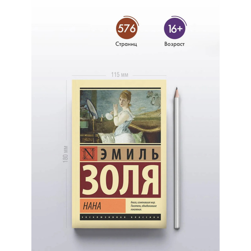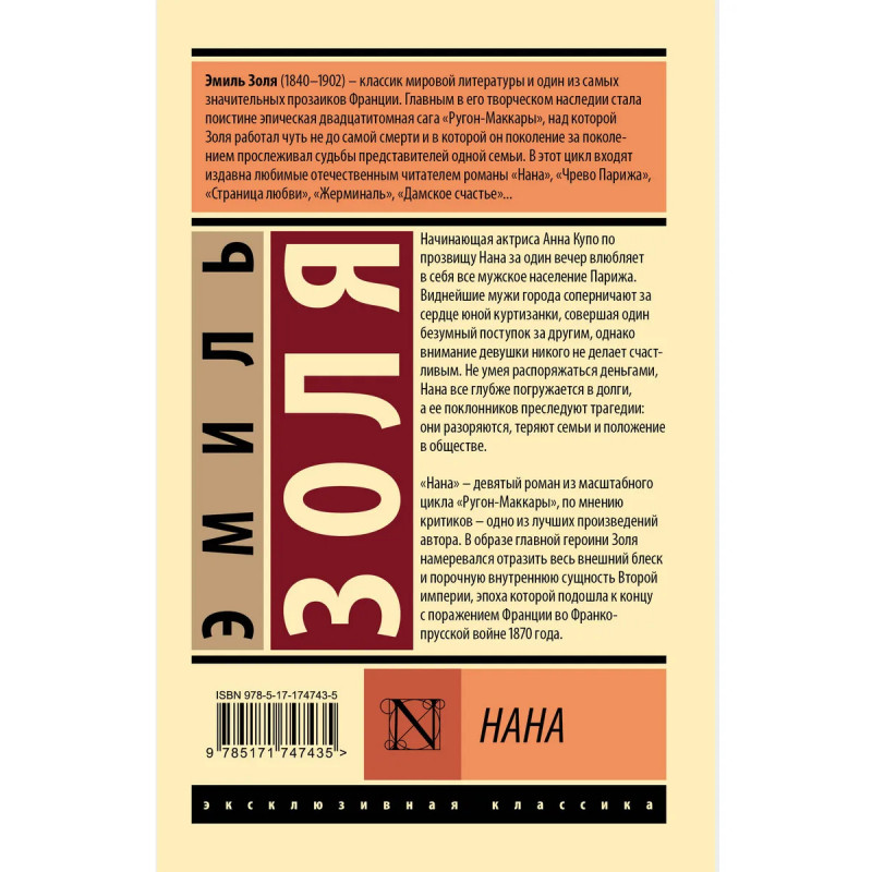 — Эмиль Золя — крупнейший представитель реализма и натурализма во французской литературе XIX века, видный писатель, драматург и публицист. — Вершиной творчества Золя считается двадцатитомный цикл «Ругон-Маккары», над которым автор работал в течение двадцати лет. Все романы цикла можно читать независимо друг от друга. — «Нана» — один из самых известных романов цикла «Ругон-Маккары». В образе главной героини Золя намеревался отразить весь внешний блеск и всю порочную внутреннюю сущность Второй империи, эпоха которой подошла к бесславному концу с поражением Франции во Франко-прусской войне 1870 года. — Издание в серии «Эксклюзивная классика» — в удобном карманном формате и узнаваемом оформлении.