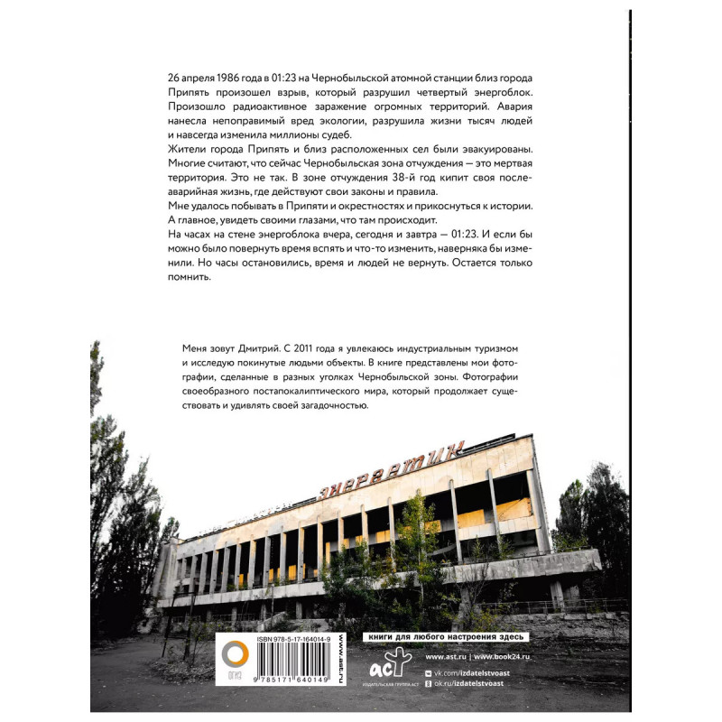 26 апреля 1986 года на в 01:23 на Чернобыльской атомной станции близ города Припять произошел взрыв, который разрушил четвертый энергоблок. Произошло радиоактивное заражение огромных территорий. Авария нанесла непоправимый вред экологии, разрушила жизни тысяч людей и навсегда изменила миллионы судеб. Жители города Припяти и близ расположенных сел были эвакуированы. Многие считают, что сейчас Чернобыльская зона отчуждения это мертвая территория. Это не так. В зоне отчуждения 38-й год кипит своя послеаварийная жизнь, где действуют свои законы и правила. Мне удалось побывать там и прикоснуться к истории. А главное увидеть своими глазами что там происходит. Часы на стене энергоблока вчера, сегодня и завтра показывают 1.23. И, если бы можно было повернуть время вспять и что-то изменить, наверняка бы изменили. Но часы остановились, время и людей вернуть. Остается только помнить.