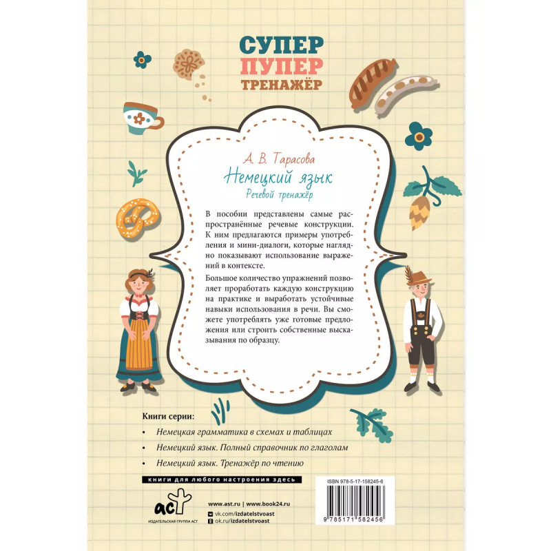 Немецкий язык. Речевой тренажер. Тарасова Анна Валерьевна - лингвист, преподаватель с многолетним опытом работы, автор популярных учебных пособий для детей и взрослых. В пособии представлены самые распространённые речевые конструкции. К ним предлагаются примеры употребления и мини-диалоги, которые наглядно показывают использование выражений в контексте. Большое количество упражнений позволяет проработать каждую конструкцию на практике и выработать устойчивые навыки использования в речи. Вы сможете употреблять уже готовые предложения или строить собственные высказывания по образцу. Это компактное издание станет вашим незаменимым помощником при изучении немецкого языка. Учебный материал соответствует знанию языка на уровнях А1 и A2.