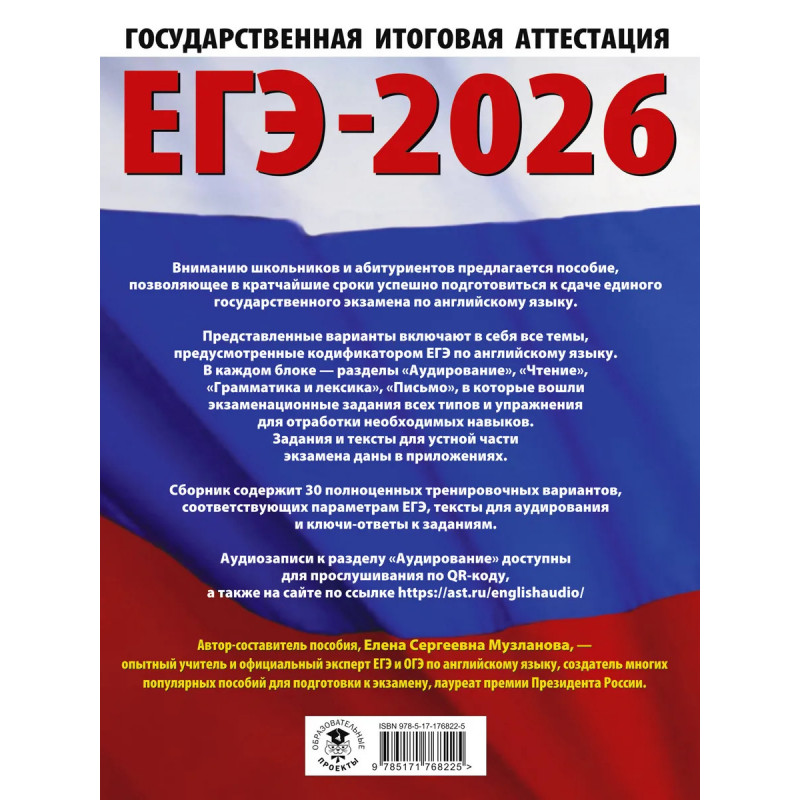 Пособие позволяет в кратчайшие сроки успешно подготовиться к сдаче единого государственного экзамена по английскому языку. Представленные варианты включают в себя все темы, предусмотренные кодификатором ЕГЭ по английскому языку. В каждом блоке — разделы "Аудирование", "Чтение", "Грамматика и лексика", "Письмо", в которые вошли экзаменационные задания всех типов и упражнения для отработки необходимых навыков. Сборник содержит 30 полноценных тренировочных вариантов, соответствующих параметрам ЕГЭ, тексты для аудирования и ключи-ответы к заданиям. К разделу "Аудирование" на сайте и QR-коду размещены фонограммы текстов для прослушивания всех вариантов пособий.