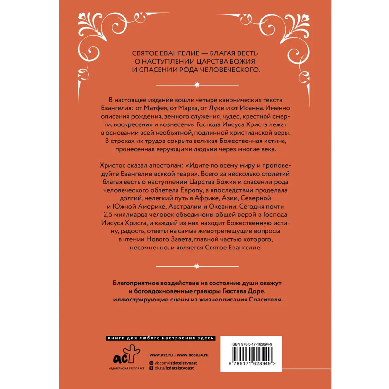 "Евангелие с иллюстрациями Гюстава Доре" - это книга, включающая в себя четыре Евангелия - от Матфея, Марка, Луки и Иоанна, с уникальными черно-белыми гравюрами известного графика Гюстава Доре. Данное издание не только представляет собой истинное и вдохновляющее свидетельство о жизни и учениях Иисуса, но и служит красивым и духовно обогащающим источником знаний о христианской вере и этике. Графические работы Гюстава Доре вдохновляют, передавая глубину и значение библейских сюжетов. В книге читатели могут насладиться мастерством художника, которое позволяет им увидеть Евангелие глазами известного мастера.