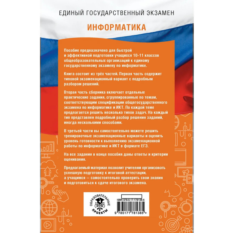 Пособие предназначено для быстрой и эффективной подготовки учащихся 10–11 классов общеобразовательных организаций к единому государственному экзамену по информатике. Книга состоит из трёх частей. Первая часть содержит типовой экзаменационный вариант с подробным разбором решений. Вторая часть сборника включает отдельные практические задания, сгруппированные по темам, соответствующим спецификации общегосударственного экзамена по информатике и ИКТ, По каждой теме предлагается решить несколько типов задач. На каждый тип представлен подробный разбор решения заданий, иногда несколькими способами. В третьей части вы самостоятельно можете решить два тренировочных экзаменационных варианта и оценить уровень готовности к выполнению экзаменационной работы по информатике и ИКТ в формате ЕГЭ. На все задания в конце пособия даны ответы и критерии оценивания.