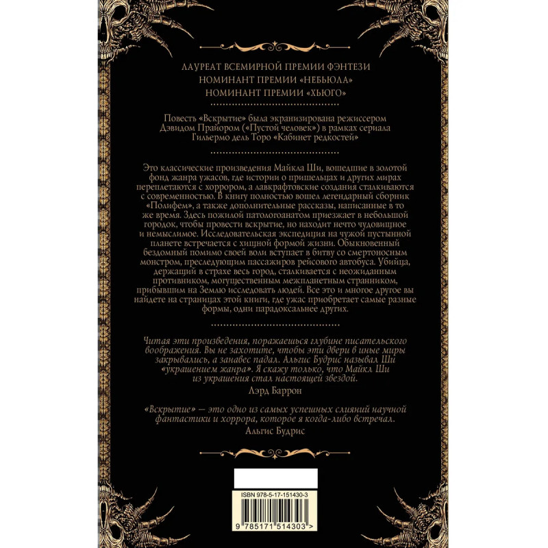 — Майкл Ши — известный писатель, работавший на стыке жанров хоррора и фэнтези, лауреат Всемирной премии фэнтези, номинант на премии «Хьюго» и «Небьюла», автор романов «Рыбалка в море демонов» и «Гнездо горной королевы». — Вошедшие в сборник «Вскрытие и другие истории» рассказы и повести относятся к золотому фонду хоррора. — Совершенно уникальный взгляд на мифы Ктулху. — Повесть «Вскрытие» легла в основу одного из эпизодов сериала Гильермо дель Торо «Кабинет редкостей».