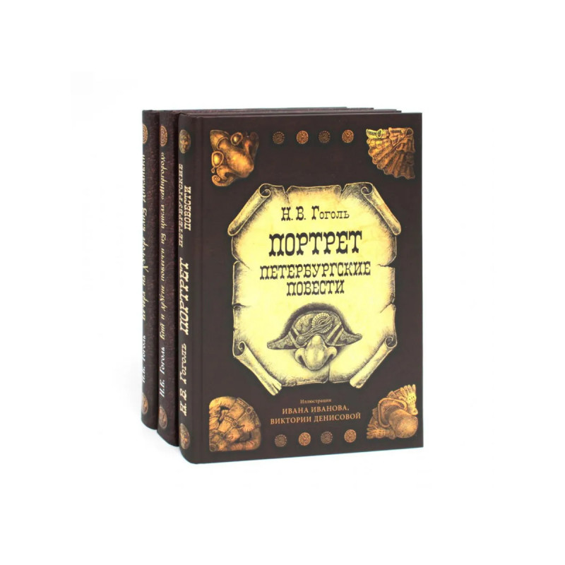 Комплект из3книг: "Вечера нахуторе близ Диканьки" Подарочное издание "Вечера нахуторе близ Диканьки" выпущено кгодовщине смерти Николая Васильевича Гоголя. Сказочные иллюстрации Ивана Иванова погружают читателя ватмосферу "тихой украинской ночи". "Вий идругие повести изцикла „Миргород“" Вкнигу вошли самые любимые российским читателем произведения Н.В.Гоголя. "Вий" следенящим душу сюжетом иколоритными персонажами, эпический "Тарас Бульба" идругие повести. Иван Иванов, который создал блестящие иллюстрации к"Вечерам нахуторе близ Диканьки" продолжил работу инад изданием "Вий идругие повести изцикла „Миргород“". "Портрет. Петербургские повести" Серия "Коллекция „Метаморфозы“" пополнилась долгожданным третьим изданием Н.В.Гоголя "Портрет. Петербургские повести". Литературные образы петербуржцев XIXвека, впечатляют ипугают современного читателя своей реалистичностью, неменьше, чем мистичностью. Ну, аПетербург Гоголя, безусловно,- главный герой каждой повести. Иллюстрации Ивана Иван