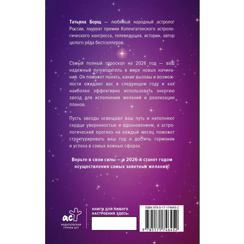 Татьяна Борщ — любимый народный астролог России, лауреат премии Копенгагенского астрологического конгресса, телеведущая, историк, автор целого ряда бестселлеров. Самый полный гороскоп на 2026 год — ваш надежный путеводитель в мире новых начинаний. Он поможет понять, какие вызовы и возможности ожидают вас в следующем году и как наиболее эффективно использовать энергию звезд для исполнения желаний и реализации планов. Пусть звезды освещают ваш путь и наполняют сердце уверенностью и вдохновением, а астрологический прогноз на каждый месяц поможет структурировать ваш год и достичь гармонии и успеха в самых важных сферах. Верьте в свои силы — и 2026-й станет годом осуществления самых заветных желаний!