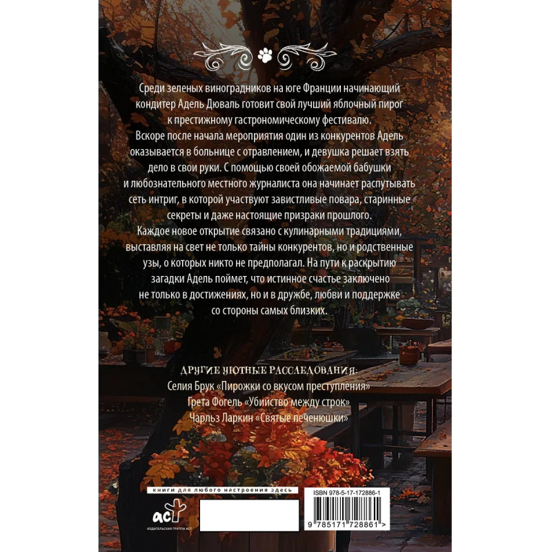 – Новая история для поклонников романа Питера Боланда «Убийства и кексики». – Уютный детектив с гастрономическими нотками в антураже юга Франции. Щедрые виноградники, традиционное гостеприимство и изысканные тортики. – Захватывающий экскурс в историю французской кухни. Кулинарные секреты и скелеты в шкафу, передаваемые из поколения в поколение. – Серия детективов «Уютные расследования» — небольшие истории с приятной атмосферой и без сцен насилия.