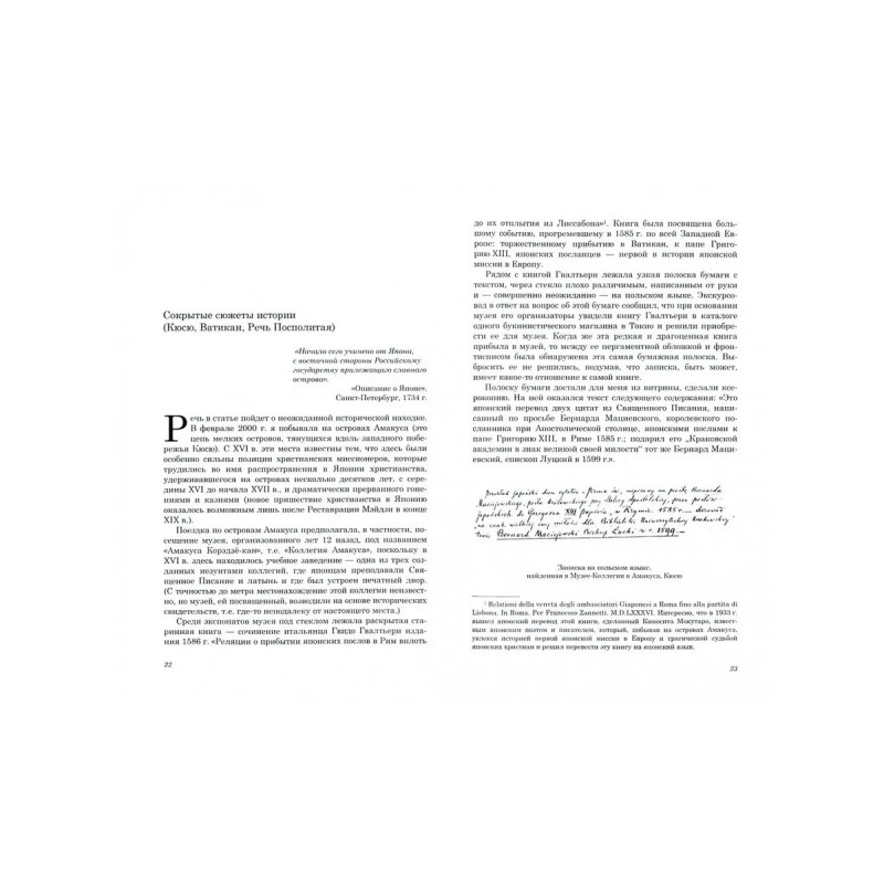 В сборник вошли статьи, эссе и очерки, написанные известным японоведом Л. М. Ермаковой за последние двадцать лет и посвященные истории российско-японских культурных контактов. Среди тем сборника встреча Николая Гумилева с японской актрисой Садаякко в Париже в 1907 г. и посвященные ей стихи; первые в Японии изображения российского персонажа (князь Московский на ширме XVII в.); судьба средневековой японской Повести о старике Такэтори в России и др. Некоторые публикации связаны с материальными находками автора: это японские переводы из псалмов Давида, сделанные в Ватикане в 1585 г.: письма писателя Танидзаки Дзюнъитиро 1920-х годов российскому японоведу О. В. Плетнеру, здесь же приведены некоторые новые факты из истории отечественного японоведения.