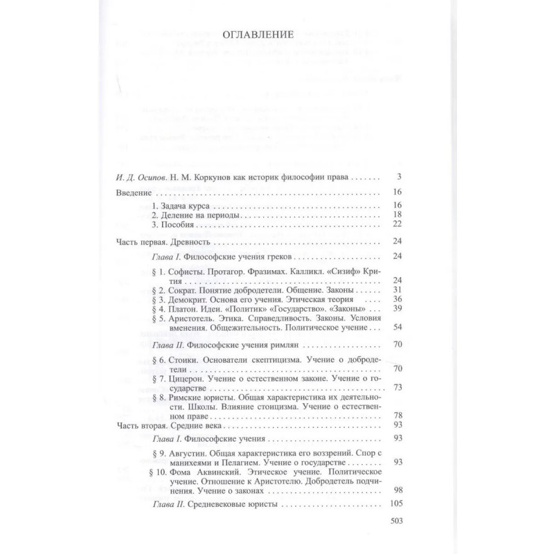 Николай Михайлович Коркунов (18531904) российский ученый-правовед, юрист, философ права, лекции которого оказали решающее влияние на отечественных мыслителей государства и права и в целом на правосознание русской интеллигенции. В настоящем издании публикуется пособие Коркунова, на которое он опирался в своих лекциях, имевших во второй половине XIX столетия оглушительный успех. Начиная рассказ об истории философии права с учений древних греков (софистов, Сократа, Платона и Аристотеля), он доводит его до позитивизма и утилитаризма современных ему философско-правовых систем. Это пособие не теряет своей значимости и сегодня, оставаясь памятником российской юридической и политической мысли, не уступающим лучшим страницам Б. Н. Чичерина и И. А. Ильина.