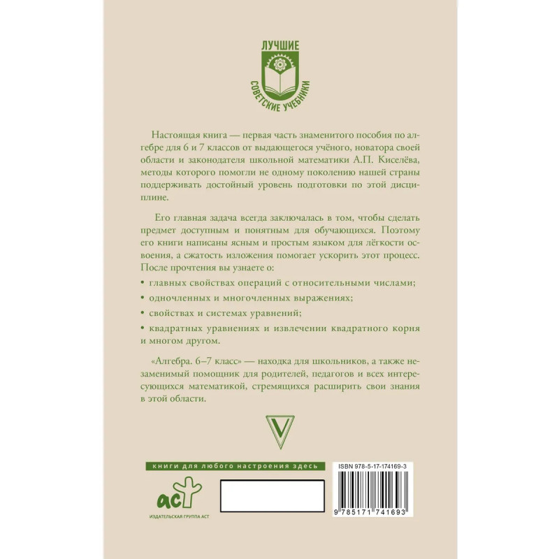 Настоящая книга – первая часть знаменитого пособия по алгебре для 6 и 7 классов от выдающегося учёного, новатора своей области и законодателя школьной математики А.П. Киселёва, методы которого помогли не одному поколению нашей страны поддерживать достойный уровень подготовки по этой дисциплине. Его главная задача всегда заключалась в том, чтобы сделать предмет доступным и понятным для обучающихся. Поэтому его книги написаны ясным и простым языком для лёгкости освоения, а сжатость изложения помогает ускорить этот процесс. После прочтения вы узнаете о: - главных свойствах операций с относительными числами; - одночленных и многочленных выражениях; - свойствах и системах уравнений; - квадратных уравнениях и извлечении квадратного корня и многом другом. "Алгебра. 6-7 класс" - находка для школьников, а также незаменимый помощник для родителей, педагогов и всех интересующихся математикой, стремящихся расширить свои знания в этой области.