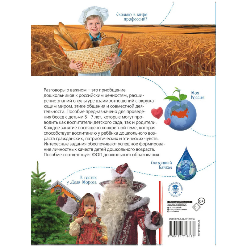 Цель "Разговоров о важном" – приобщение дошкольников к российским ценностям, расширение знаний о культуре взаимоотношений с окружающим миром, этике общения и совместной деятельности. Каждое занятие посвящено конкретной теме, которая воспитывает гражданские, патриотические и этические чувства маленьких граждан нашей страны. В каждой теме детям предлагаются различные увлекательные задания, соответствующие их возрасту. Пособие предназначено родителям и воспитателям детского сада.