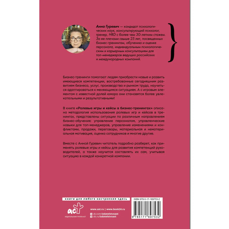В книге "Ролевые игры и кейсы в бизнес-тренингах" описана методология использования ролевых игр и кейсов в тренингах, представлены ситуации по различным направлениям бизнес-обучения: управление персоналом, управленческие навыки для топ-менеджеров, управление изменениями и конфликтами, продажи, переговоры, материальная и нематериальная мотивация, оценка сотрудников и многие другие.