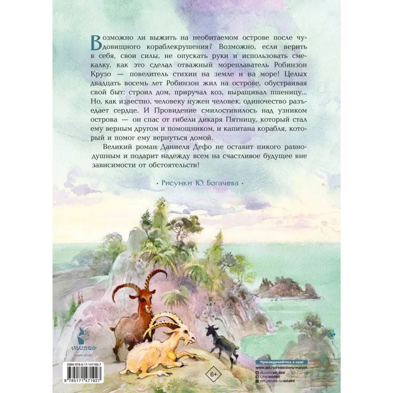 Возможно ли выжить на необитаемом острове после чудовищного кораблекрушения? Возможно, если верить в себя, свои силы, не опускать руки и использовать смекалку, как это сделал отважный мореплаватель Робинзон Крузо повелитель стихии на земле и на море! Целых двадцать восемь лет Робинзон жил на острове, обустраивая свой быт: строил дом, приручал коз, выращивал пшеницу Но, как известно, человеку нужен человек, одиночество разъедает сердце. И Провидение смилостивилось над узником острова он спас от гибели дикаря Пятницу, который стал ему верным другом и помощником, и капитана корабля, который и помог ему вернуться домой. Великий роман Даниеля Дефо не оставит никого равнодушным и подарит надежду всем на счастливое будущее вне зависимости от обстоятельств!