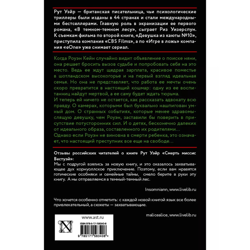 Поворот ключа. Когда Роуэн Кейн случайно видит объявление о поиске няни, она решает бросить вызов судьбе и попробовать себя на это место. Ведь ее ждут щедрая зарплата, красивое поместье в шотландском высокогорье и на первый взгляд идеальная семья. Но она не представляет, что работа ее мечты очень скоро превратится в настоящий кошмар: одну из ее воспитанниц найдут мертвой, а ее саму будет ждать тюрьма. И теперь ей ничего не остается, как рассказать адвокату всю правду. О камерах, которыми был буквально нашпигован умный дом. О странных событиях, которые менее здравомыслящую девушку, чем Роуэн, заставили бы поверить в присутствие потусторонних сил. И о детях, бесконечно далеких от идеального образа, составленного их родителями Однако если Роуэн невиновна в смерти ребенка, это означает, что настоящий преступник все еще на свободе