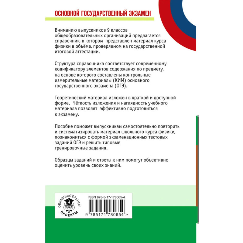 Данный справочник содержит весь теоретический материал по курсу физики, необходимый для сдачи основного государственного экзамена в 9 классе. Он включает в себя все элементы содержания, проверяемые контрольными и измерительными материалами, и помогает обобщить и систематизировать знания и умения за курс основной школы. Теория курса дана в краткой и доступной форме. Каждый раздел сопровождается примерами тестов. Практические задания соответствуют формату ОГЭ. Они дают исчерпывающее представление о типах заданий экзаменационной работы и о степени их сложности. В конце пособия даны ответы на все задания, а также необходимые справочные таблицы. Пособие может быть использовано учащимися для подготовки к ОГЭ и самоконтроля, а учителями – для подготовки учащихся основной школы к итоговой аттестации по физике.