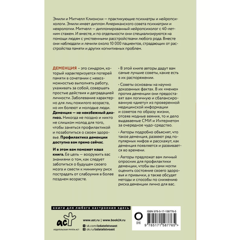 Деменция это синдром, который характеризуется потерей памяти в сочетании с невозможностью выполнять работу, ухаживать за собой, совершать простые действия, и деградацией личности. Заболевание характерно для лиц пожилого возраста, но им болеют и молодые люди. Но деменция не неизбежный диагноз. Никогда не поздно и никто не слишком молод для того, чтобы заняться профилактикой и позаботиться о своем здоровье. Профилактика деменции доступна вам прямо сейчас. И в этом вам поможет наша книга. Ее цель вооружить вас знаниями о том, как следует заботиться о будущем своего мозга и свести к минимуму риск пострадать от слабоумия в более позднем возрасте. Эта книга основана на общем профессиональном и клиническом стаже авторов, насчитывающем 70 лет исследований и практики в медицине и нейропсихологии, на анализе тысяч статей и исследований и на опыте применения этих принципов для 10 000 пациентов.