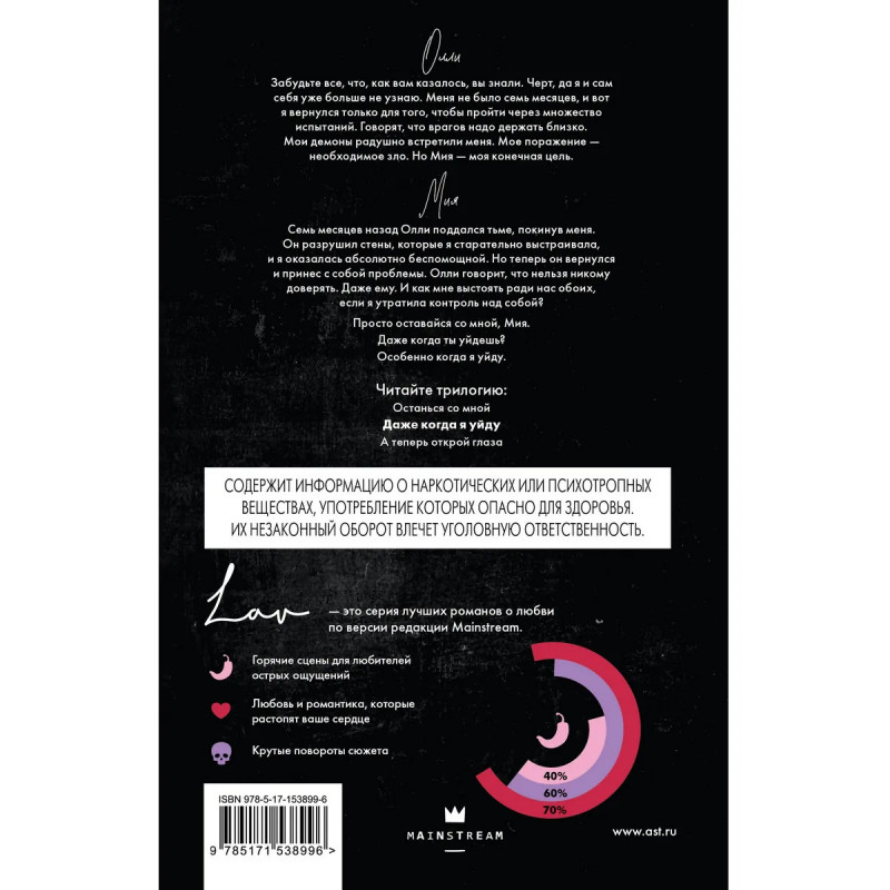 Олли Забудьте все, что, как вам казалось, вы знали. Черт, да я и сам себя уже больше не узнаю. Меня не было семь месяцев, и вот я вернулся только для того, чтобы пройти через множество испытаний. Говорят, что врагов надо держать близко. Мои демоны радушно встретили меня. Мое поражение — необходимое зло. Но Мия — моя конечная цель. Мия Семь месяцев назад Олли поддался тьме, покинув меня. Он разрушил стены, которые я старательно выстраивала, и я оказалась абсолютно беспомощной. Но теперь он вернулся и принес с собой проблемы. Олли говорит, что нельзя никому доверять. Даже ему. И как мне выстоять ради нас обоих, если я утратила контроль над собой? Просто оставайся со мной, Мия. Даже когда ты уйдешь? Особенно когда я уйду.