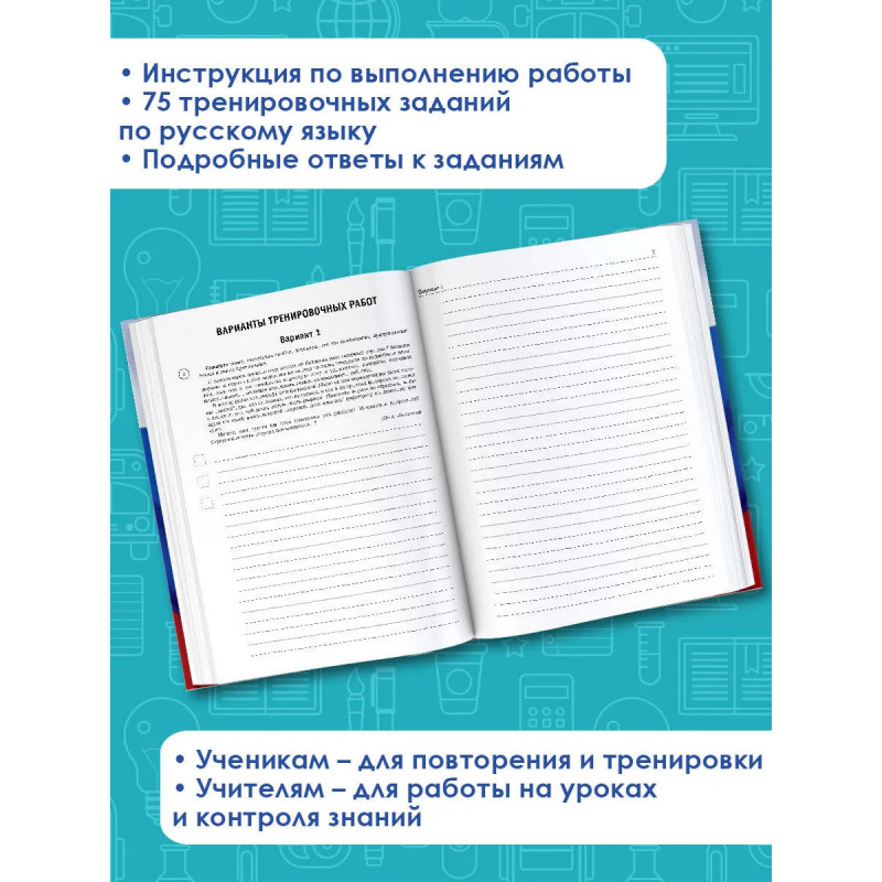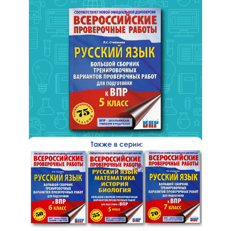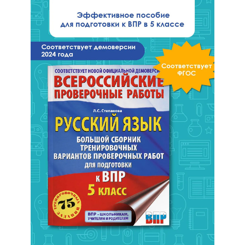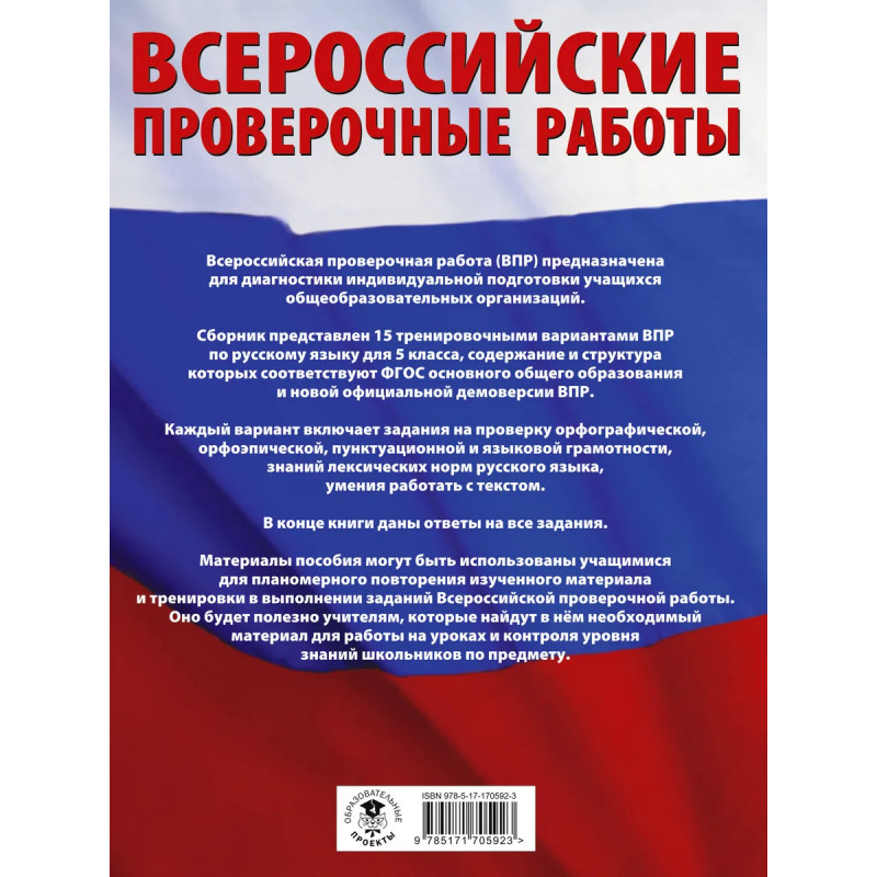 Пособие предназначено для подготовки учащихся 5 классов общеобразовательных организаций к Всероссийской проверочной работе (ВПР) по русскому языку. Сборник содержит 15 тренировочных вариантов ВПР, позволяющих оценить индивидуальные достижения школьников по предмету. Каждый вариант включает задания на проверку орфографической, орфоэпической, пунктуационной и языковой грамотности , умения работать с текстом. В конце книги даны ответы на все задания и критерии оценивания их выполнения. Материалы пособия могут быть использованы учащимися для планомерного повторения изученного материала и тренировки в выполнении заданий Всероссийской проверочной работы. Оно будет полезно учителям, которые найдут в нём необходимый материал для работы на уроках и контроля уровня знаний школьников по предмету.