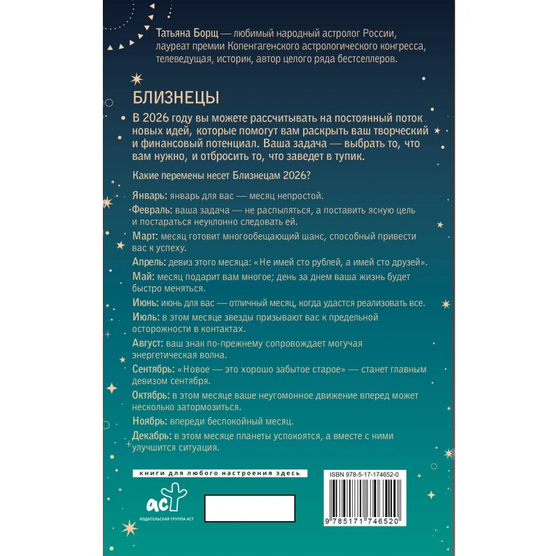 Татьяна Борщ — любимый народный астролог России, лауреат премии Копенгагенского астрологического конгресса, телеведущая, историк, автор целого ряда бестселлеров. В 2026 году вы можете рассчитывать на постоянный поток новых идей, которые помогут вам раскрыть ваш творческий и финансовый потенциал. Ваша задача — выбрать то, что вам нужно, и отбросить то, что заведет в тупик. Какие перемены несет Близнецам 2026?