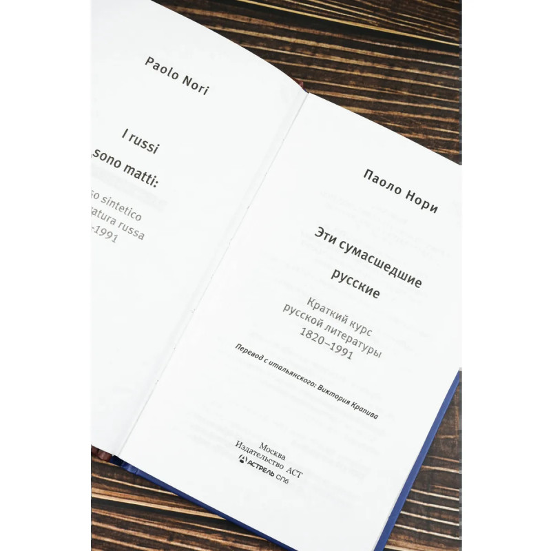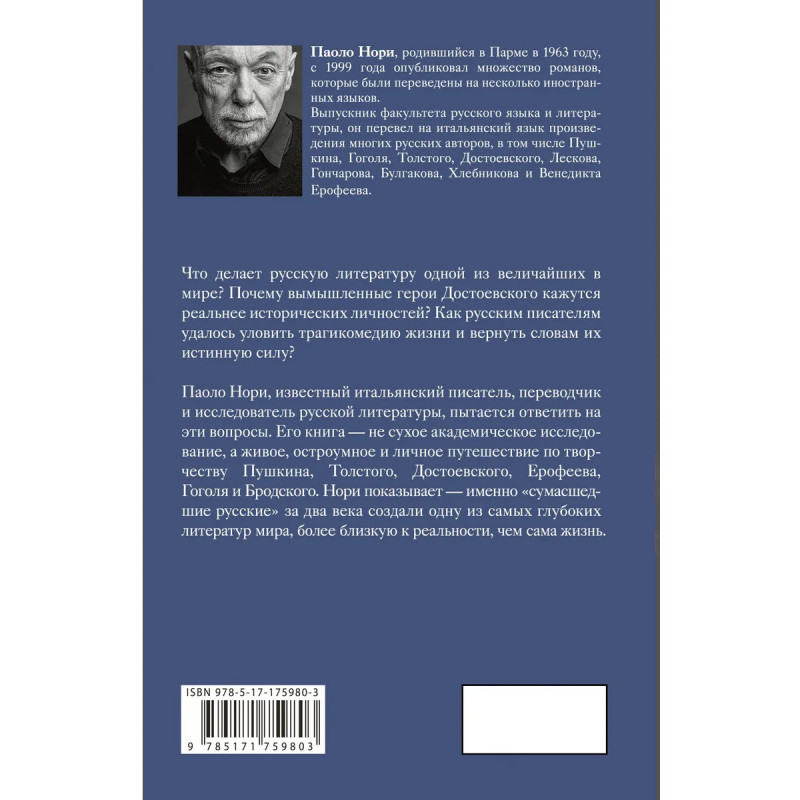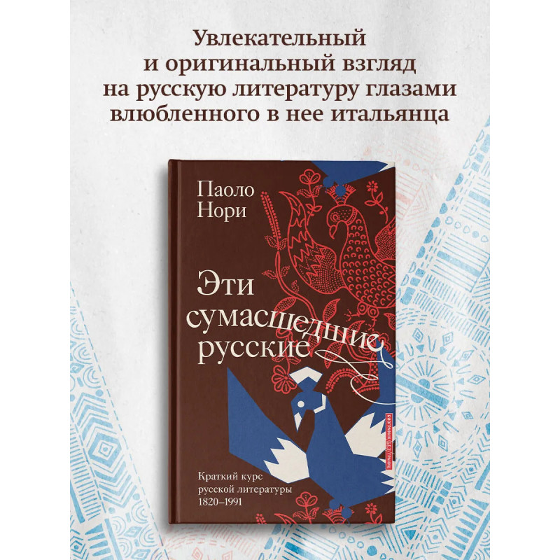 — Паоло Нори — современный итальянский писатель, переводчик, специалист по русской литературе. Перевел на итальянский язык произведения Пушкина, Толстого, Достоевского, Булгакова, Хлебникова и Венедикта Ерофеева. Автор книг «Невероятная жизнь Фёдора Михайловича Достоевского. Всё ещё кровоточит» и «Невероятная жизнь Анны Ахматовой. Мы и Анна Ахматова». — «Эти сумасшедшие русские. Краткий курс русской литературы 1820-1991» — это оригинальный взгляд на русскую литературу последних двух столетий глазами влюбленного в нее иностранца. Это живое, остроумное и очень личное путешествие по творчеству Достоевского и Пушкина, Гоголя, Толстого, Бродского и Ерофеева.