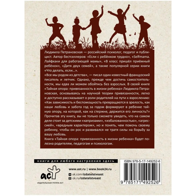Абсолютный бестселлер от Людмилы Петрановской автора, суммарный тираж вышедших книг которого превышает 1 экземпляров! Вместе с ребенком и его родителями вы пройдете путь от рождения до взрослости. Вы построите дорожную карту взросления и рассмотрите роль привязанности в этом процессе. Людмила Петрановская сосредоточивается на отношениях ребенка со своими взрослыми. Каждая глава книжки это очередной этап детства. Каждый этап это новые задачи возраста, новые потребности ребенка, новые возможности, но и новые риски, если потребности не будут удовлетворены. Книга позволит вам понять логику: как зависимость и беспомощность превращаются в зрелость, как наши любовь и забота год за годом формируют в ребенке тайную опору, на которой, как на стержне, держится его личность.