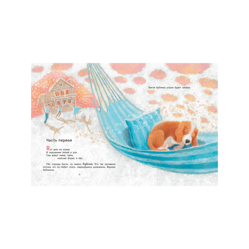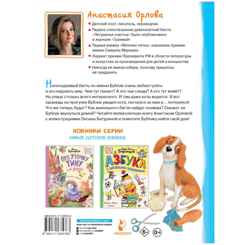 Анастасия Орлова - детский поэт, писатель, переводчик. Первое стихотворение девятилетней Насти «Лягушачье счастье» было опубликовано в журнале «Трамвай». Первая книжка «Яблочки-пятки» завоевала премию имени Самуила Маршака. Лауреат премии Президента РФ в области литературы и искусства за произведения для детей и юношества. Никогда не имела собаки, поэтому пришлось её придумать. Непоседливый бигль по имени Бублик очень любил гулять и исследовать мир. Чем тут пахнет? А это чьи следы? А кто тут живёт? На улице столько всего интересного. И там даже коты водятся. И вот однажды на прогулке Бублик увидел кота, погнался за ним и… потерялся! Что же теперь будет? Как маленького бигля найдут хозяева? Сможет ли Бублик вернуться домой? Читайте великолепную книгу Анастасии Орловой с иллюстрациями Оксаны Батуриной и помогите Бублику найти свой дом!