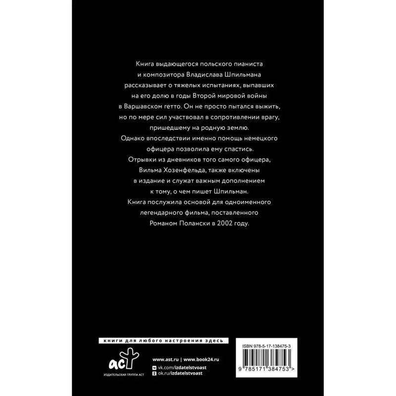 Книга выдающегося польского пианиста и композитора Владислава Шпильмана рассказывает о тяжёлых испытаниях, выпавших на его долю в годы Второй мировой войны в Варшавском гетто. Он не просто пытался выжить, но по мере сил участвовал в сопротивлении врагу, пришедшему на родную землю. Однако впоследствии именно помощь немецкого офицера позволила ему спастись. Отрывки из дневников того самого офицера, Вильма Хозенфельда, также включены в издание и служат важным дополнением к тому, о чем пишет Шпильман. Книга послужила основой знаменитому фильму, поставленному Романом Полански.